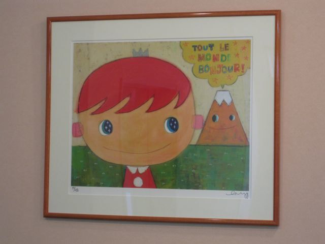 受付の絵が目を引くと言われましたので、少しご紹介させていただきます。作者はアリカワコウヘイさんで、沖縄在住のクレパス画家の方 です。この方の作品を見たのは1~2年前に地元の百貨店の絵画コーナーでした。数点の作品が紹介されていましたが、どれも明るくて元気 が出るタッチが目に飛び込んできました。ただ、自宅に飾るには他の 絵との釣り合いが取れないかなと、躊躇していました。でも、ポップ なタッチは心に残っていました。 今回、クリニックを開くに当たって、「元気でいきいき生きる」を テーマに診療をしようと考えていて、飾る絵にはアリカワさんの絵以外はないと思いました。以前に見たものはすでに売れてしまったそうで、同じ構図のリトグラフを取り寄せてい ただきました。 クリニックに飾ると、にこにこした「マシューくん」の笑顔で元気をもらっています。みなさんも「マシューく ん」の笑顔を見に来てください。