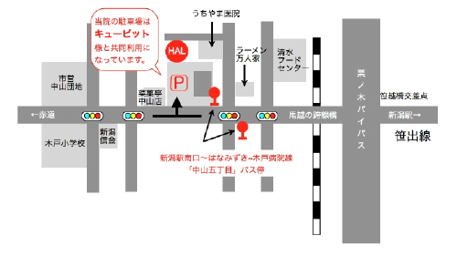 新潟駅南口バスターミナルからお乗りください。「中山五丁目」で下車して、進行方向の信号で横断歩道を 渡り、「スーパーキューピット」の駐車場に入っていただくと、正面に当院があります。(所要時間2分前後)