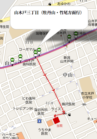 「竹尾・卸会館前行」「牡丹山経由東部営業所行」「牡丹山経由北高校前行」にお乗りください。新潟駅か らお越しの場合は、中央郵便局前の「明石一丁目」からお乗りください。「山木戸三丁目」で下車して、少し 戻ったところにある横断歩道を渡り、そのまま南方向へやく450m直進してください。「ライズ」や「ほっと もっと」のある大通りに出たら、横断歩道を渡って右折して「菜菓亭」の前を通り進むと左手に「スーパーキ ューピット」が見えます。その駐車場に入っていただくと、正面に当院があります。(所要時間7分前後)